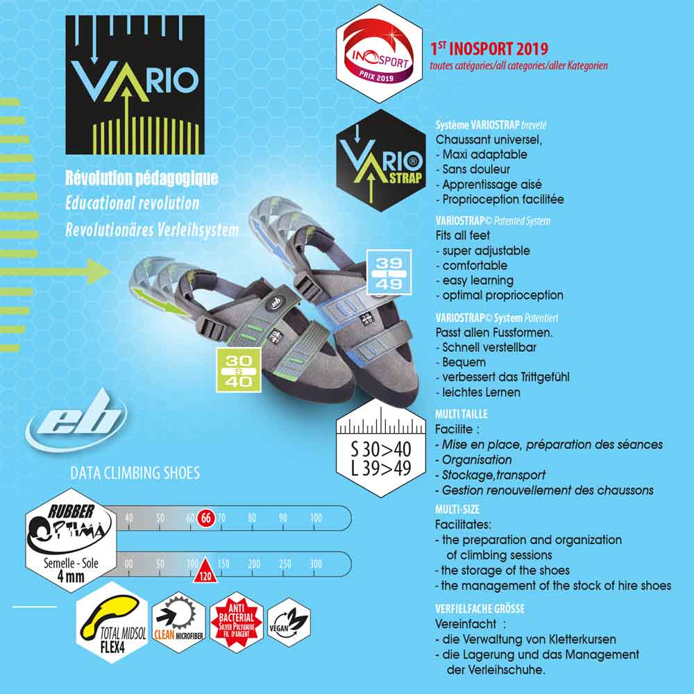Le VARIO RÉVOLUTIONNE l’organisation pédagogique des collectivités tout en conservant les qualités techniques d’un chausson d’escalade traditionnel. Il facilite la mise en place d’une séance d’escalade par un choix simplifié entre 2 couleurs différentes représentant chaque pointure. En effet, les deux tailles du VARIO s’adaptent à toutes les pointures (du 30 au 49). Le réglage est facile et instantané. Les membres d’une même cordée peuvent se l’échanger aisément. Le stockage est réduit. L’économie financière dans l’investissement d’un parc de chaussons est réelle.